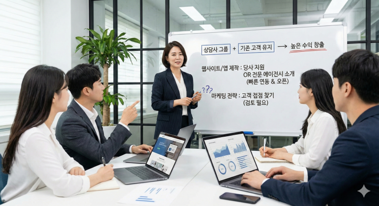 3. 상담사로 참여하셨고 주변의 뜻이 맞는 그룹이 있으실경우 해당 인력과 협의하시어 기존 고객을 신규서비스 번호로 유지하여 기존 상담시간에 따른 페이보다 높은 수익을 가져가시고자 하는 대표님의경우는 상담사의 관리는 유연하지만 마케팅과 사이트 제작에 어려움이 발생할수 있습니다. 이경우에는 웹사이트(앱)제작은 아시는 지인업체나 당사가 지금까지 연동한 웹에이전시중 기술력이 뛰어난 업체를 소개해드리기도 하므로 검토하셔서 빠른 연동과 오픈이 가능할수 있습니다. 다만 마케팅의 영역은 다른 영역이기 때문에 사전 사업을 구성하실때 어떤식의 마케팅으로 고객과의 접접을 찾으실지는 검토해보시는것이 좋을것 같습니다.