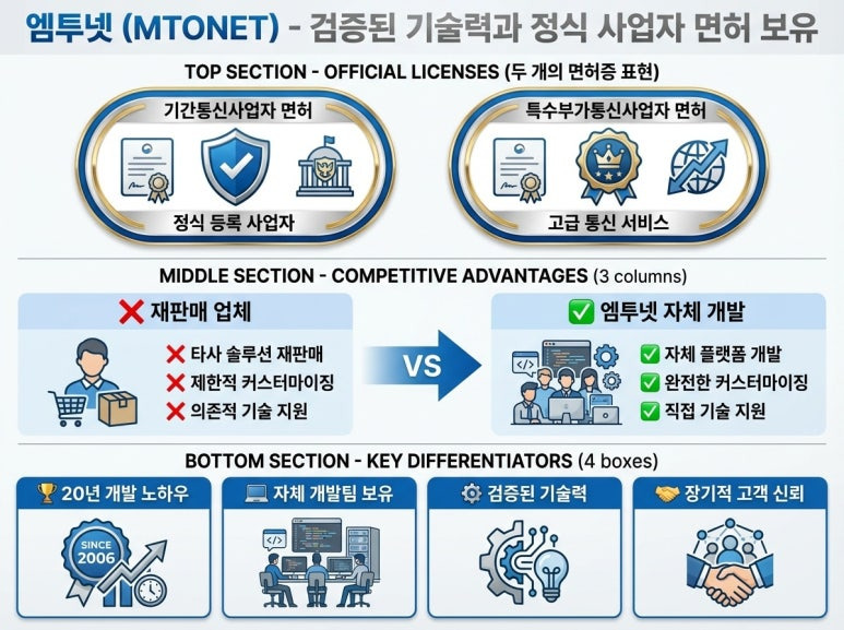 두 가지 핵심 면허를 모두 보유한 검증된 통신 전문 기업으로, 직접 플랫폼을 개발하고 운영합니다.