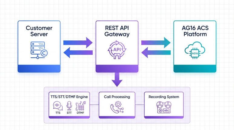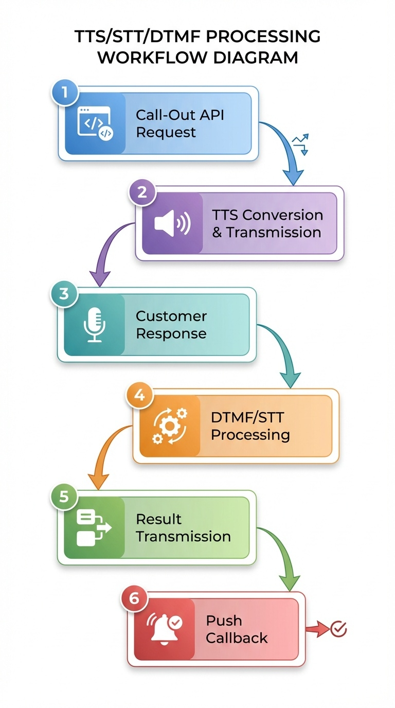 ① Call-Out API 호출 고객사가 REST API로 발신 요청을 보냅니다. 발신할 고객 목록, 음성 멘트, DTMF 허용 입력값 등을 JSON으로 전달합니다.