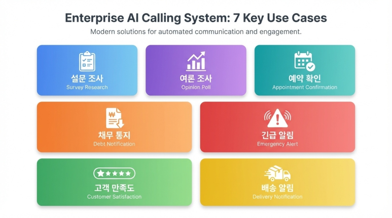 (주)엠투넷의 AI PDS는 REST API 기반으로 설계되어, 고객사의 비즈니스 요구에 맞게 자유롭게 커스터마이징됩니다. 설문조사부터 긴급 재난 알림까지, 7가지 활용 시나리오를 살펴보겠습니다.